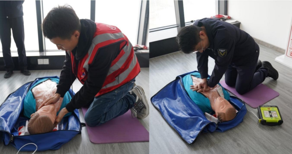 本次培訓(xùn)分為理論講解及現(xiàn)場實操,理論講解涵蓋突發(fā)事件急救常識、急救程序等知識和技能,現(xiàn)場實操由紅十字會救援老師親自示范心肺復(fù)蘇及AED救護(hù)流程?!坝米笫终聘o貼病人的胸部,兩手重疊,左手五指翹起,雙臂深直,用上身力量用力按壓30次,按壓深度至少5CM,按壓頻率至少100次每分鐘” 紅十字會救援老師一邊演示,一邊強(qiáng)調(diào)重點,用生動直觀的方式,幫助參訓(xùn)員工快速掌握急救要領(lǐng)和技巧。