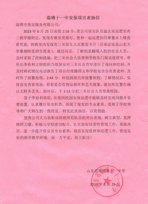 6月29日市保安公司駐淄博市第十一中學(xué)崗點(diǎn)收到學(xué)校送來的一封感謝信。信中對保安隊(duì)員溫志安、董永以及班長李春和項(xiàng)目負(fù)責(zé)人滕國義提出表揚(yáng)。6月25日凌晨2時16分,派駐淄博第十一中學(xué)保安隊(duì)員溫志安、董永巡邏至高二教學(xué)樓附近發(fā)現(xiàn)有三名陌生人在散發(fā)卡片(后來證實(shí)是山東大學(xué)暑期培優(yōu)招生簡章)。通過問話,了解到是翻墻入校的社會人員,及時采取了控制措施,班長李春和及時將此情況電話報告了項(xiàng)目負(fù)責(zé)人滕國義和學(xué)校安全辦負(fù)責(zé)老師,并及時作了報警處理。2時44分,科技園派出所接警到校,了解情況后,確認(rèn)無財物丟失、損壞后,于3時13分把三名社會人員帶離校園。為表彰先進(jìn)、弘揚(yáng)正氣,在保安隊(duì)伍中積極營造干事創(chuàng)業(yè)、爭先創(chuàng)優(yōu)的良好氛圍,7月11日上午,對以上四名同志作出相對應(yīng)的現(xiàn)金獎勵,十一中校領(lǐng)導(dǎo)和公司項(xiàng)目負(fù)責(zé)人召開專題會議共同為隊(duì)員進(jìn)行了表彰。“平凡崗位,點(diǎn)滴熱忱”李春和班組,在夜間校園安保巡邏中能夠及時發(fā)現(xiàn)問題并妥善處置,認(rèn)真履行保安職責(zé),不僅體現(xiàn)了市保安公司保安隊(duì)員的專業(yè)素質(zhì),而且為其他保安隊(duì)員樹立了學(xué)習(xí)的榜樣。